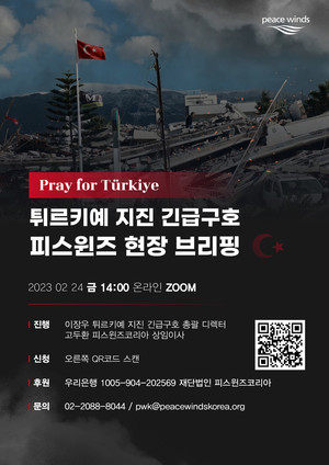 (재)피스윈즈코리아 긴급구호팀(이하 피스윈즈)이 튀르키예 지진 발생 현장에서 긴급 브리핑을 진행한다.피스윈즈는 지난 6일 튀르키예와 시리아에서 지진이 발생한 직후부터 튀르키예 현장에 출동하여 구호 활동을 이어 오고 있다. 국제연합(유엔, UN) 개발 전문가들에 따르면, 사망자는 4만1천 명을 넘어서고 최소 50만 채의 주택을 새로 지어야 할 남부지역에서 150만 명이 노숙자가 됐다.피스윈즈는 이러한 현장 상황을 더 정확하게 전달하고자 24일 오후 2시 '튀르키예 지진 긴급구호 현장 브리핑'을 진행한다. 온라인 줌(ZOOM) 방식으로