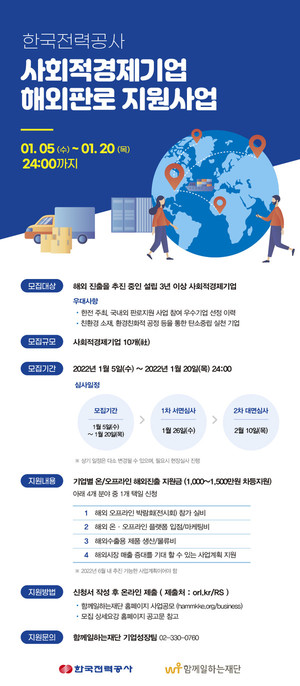 함께일하는재단과 한국전력공사가 '사회적경제기업 해외판로 지원사업'에 참가할 사회적경제기업을 모집한다.함께일하는재단 측은 "사회적경제기업의 원활한 해외판로 개척을 지원하고자 '사회적경제기업 해외판로 지원사업'(이하 지원사업)에 참여할 사회적경제기업을 이달 20일까지 모집한다. 이번 사업은 코로나19로 어려움을 겪고 있는 사회적경제기업의 수출 활성화를 지원, 글로벌 경쟁력을 강화하고 사회적 가치를 확장시키고자 기획됐다"고 밝혔다. 지원대상은 해외 온오프라인 진출을 추진 중인 설립 3년 이상의 (예비)사회적기업, (사회적)협동조합, 소셜
