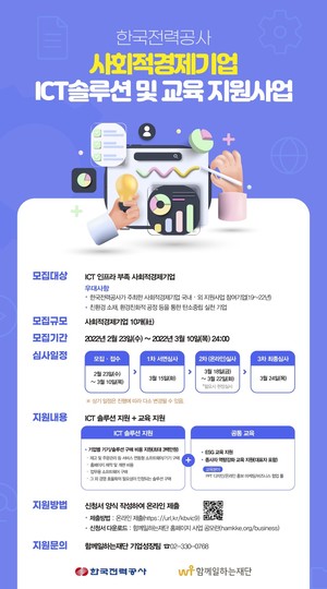 한국전력공사-함께일하는재단, '사회적경제기업 ICT 솔루션 및 교육 지원사업' 참여기업 모집