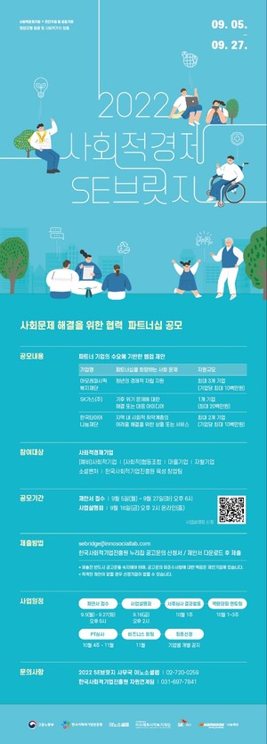 한국사회적기업진흥원은 오는 27일까지 민간 기업과 사회적경제기업간 협업을 통한 사회문제 해결을 지원하기 위해 '2022년 사회적경제 SE(Social Enterprise·사회적기업) 브릿지 프로그램' 참여기업을 모집한다.올해로 4회째를 맞는 이 프로그램은 사회문제 해결에 관심 있는 민간기업을 사회적기업과 연결해 사회적기업의 지속적인 성장을 돕는다.올해는 SK가스(환경 분야), 아모레퍼시픽복지재단(청년 자립), 한국타이어나눔재단(지역 취약계층 지원)이 파트너사로 참여한다.SK가스는 기후 위기 문제에 대한 해결 또는 대응 아이디어를 제