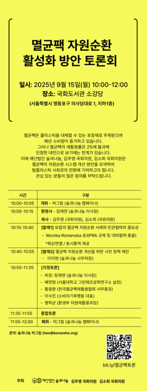 재단법인 숲과나눔은 오는 15일 국회도서관 소강당에서 '멸균팩 자원순환 활성화 방안 토론회'를 개최한다. 이번 행사는 김주영, 김소희 국회의원이 공동 주최한다. 멸균팩은 플라스틱을 대체할 수 있는 포장재로 소비량이 매년 증가하고 있지만, 재활용률은 2%에 불과해 자원순환 측면에서 한계가 지적되고 있다. 이번 토론회는 멸균팩의 재활용 문제를 구체적으로 짚어보고, 자원순환 시스템 개선을 통해 탈플라스틱 사회로 나아가기 위한 정책적 대안을 모색하기 위해 마련됐다. 행사는 숲과나눔 허그림 캠페이너의 진행으로, 발제는 EXPRA 규제 및 대