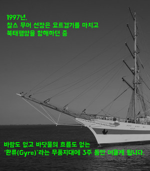 1997년, 찰스 무어 선장은 요트경기를 마치고 북태평양을 항해하던 중바람도 없고 바닷물의 흐름도 없는 ‘환류(Gyre)’라는 무풍지대에 3주 동안 머물게 됩니다.무풍지대를 벗어나기 위해 항로를 변경하다 지도에는 없던 섬 하나를 발견하게 됩니다. 바로 유령처럼 둥둥 떠다니는 거대한 쓰레기 섬입니다. 일명 “태평양 거대 쓰레기 지대 (The Great Pacific Garbage Patch)”이후, 선장은 해양환경운동가로 나서게 됩니다.쓰레기 섬은 어떻게 됐냐 구요?국가가 되었어요.2017년, 6월 8일 세계해양의날. 플라스틱 오션