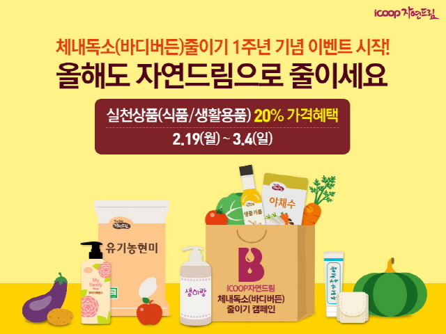 자연드림이 바디버든(체내독소) 줄이기 캠페인 1주년을 맞아 실천상품 32종을 구성해 20% 가격 혜택을 제공하는 이벤트를 실시한다. 가격 인하를 통해 참여의 문턱을 낮춰 캠페인 효과를 높이겠다는 기획이다.