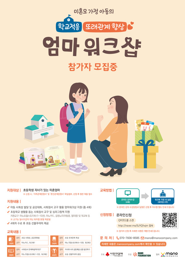 자녀의 초등학교 입학은 수많은 일하는 엄마들이 퇴직을 고민하는 시기라고 한다. 아이가 잘 적응할지, 또래관계는 괜찮은지 신경이 많이 쓰여서다. 이를 홀로 감당해야하는 한부모 가정이라면 고민이 더 커질 수 있다. 사회적기업 마노컴퍼니가 초등학교 저학년 학생을 둔 미혼모 가정의 자녀 학교 적응과 또래관계 향상을 지원하기 위한 온라인 워크샵을 진행한다.