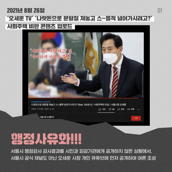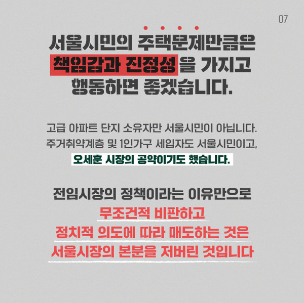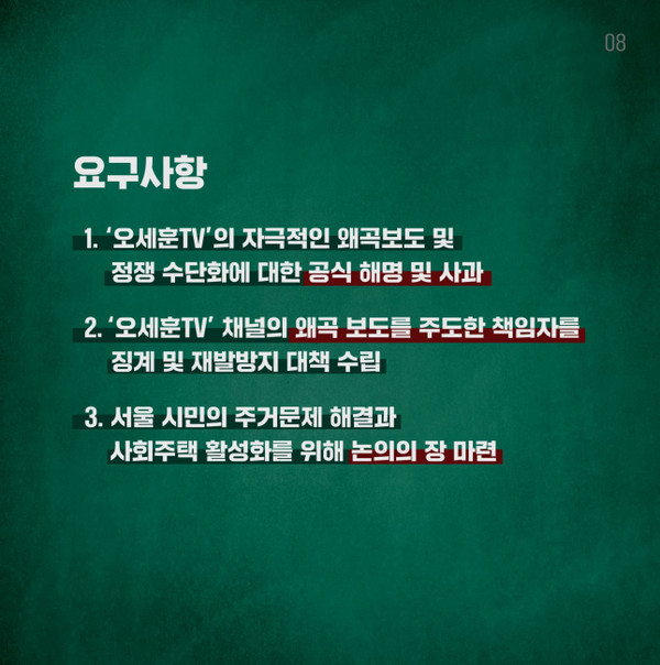- "오 시장은 사회주택에 대해 왜곡·과장하여 유튜브에 공개한 것 사과하라!"