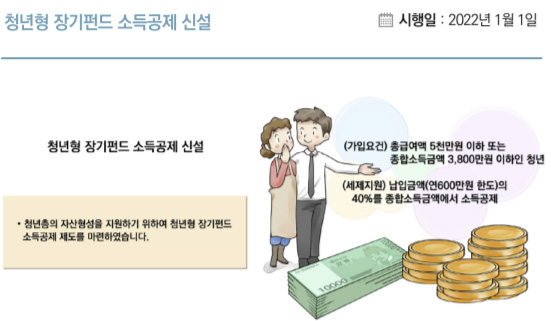 청년층의 자산형성 지원을 위해 청년형 장기펀드(연 납입한도 600만원)에 대한 소득공제(공제율 40%)를 적용하는 한편,청년희망적금(연 납입한도 600만원)을 출시(1분기 예정)하고, 동 적금을 통해 지급받는 이자소득에 대해 비과세