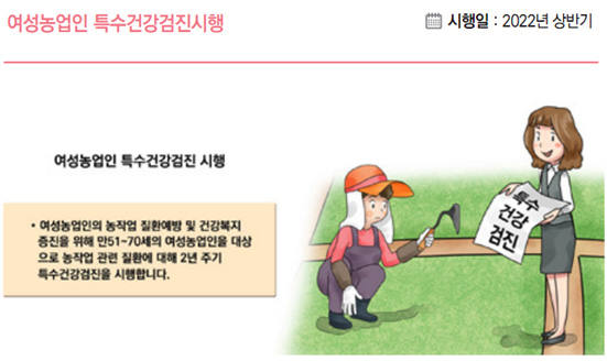 여성농업인의 농작업 질환예방 및 건강복지 증진을 위해 만 51~70세의 여성농업인을 대상으로 농작업 관련 질환에 대해 특수건강검진을 시행한다. 지자체 공모를 통해 여성농업인 9000명을 선정해 특수건강검진을 지원할 예정이다.