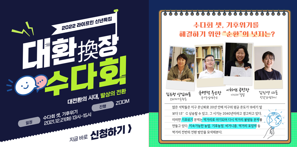 12월은 역시나 마무리의 시기인가보다. 연일 문자 메시지는 한해를 정리하고 다음을 계획하기 위해 모임에 참석해달라는 내용으로 차기 시작했다. 쌓여가던 메시지를 바로 확인을 못 하다가 하마터면 라이프인의 이번 수다회의 참여 신청 문자를 놓칠 뻔했다. 라이프인 신년특집 <대환(換)장 "발상의 전환(轉換)"> 수다회 셋, 기후위기는 소비자기후행동의 활동가로서 무척 관심이 가는 주제였다. 다행히 늦지 않게 신청이 되어 참여 할 수 있는 ZOOM링크가 문자로 잘 전송이 되어왔다.