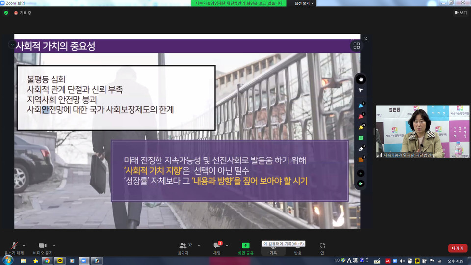 19일 '사회적경제 조직의 ESG 활성화 방안'이란 주제로 열린 5회차 세미나는 박주원 지속가능경영재단 ESG 경영센터장이 사회를 맡았으며, 파주시에서 사회적기업 수호천사를 운영하는 윤경자 대표가 발표자로 참여했다.
