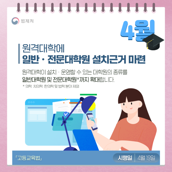 원격대학이 설치‧운영할 수 있는 대학원을 현행 특수대학원에서 일반대학원 및 (의학, 치의학, 한의학 및 법학 분야를 제외한)전문대학원까지 확대한다.