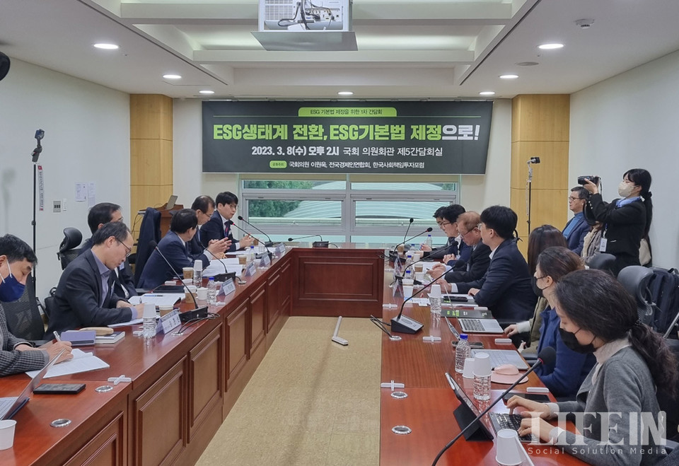 8일 국회 의원회관 제5간담회실에서 국내 ESG 관련 전문가, 연구자, 관계 공무원, 시민 등이 참석한 가운데, 'ESG 생태계 전환, ESG 기본법 제정으로' 간담회가 열렸다.