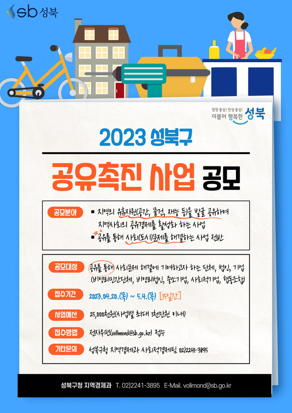 성북구는 다양한 지역 자원을 공유해 사회적 가치를 창출할 수 있는 '2023 성북구 공유촉진 사업'을 공모한다고 24일 밝혔다. 공유촉진 사업은 지역의 유휴 공간, 주민의 물건, 재능, 경험 등 지역자원의 공유를 통해 사회적 가치를 창출하고 지역사회 공유경제를 활성화하는 사업이다.
