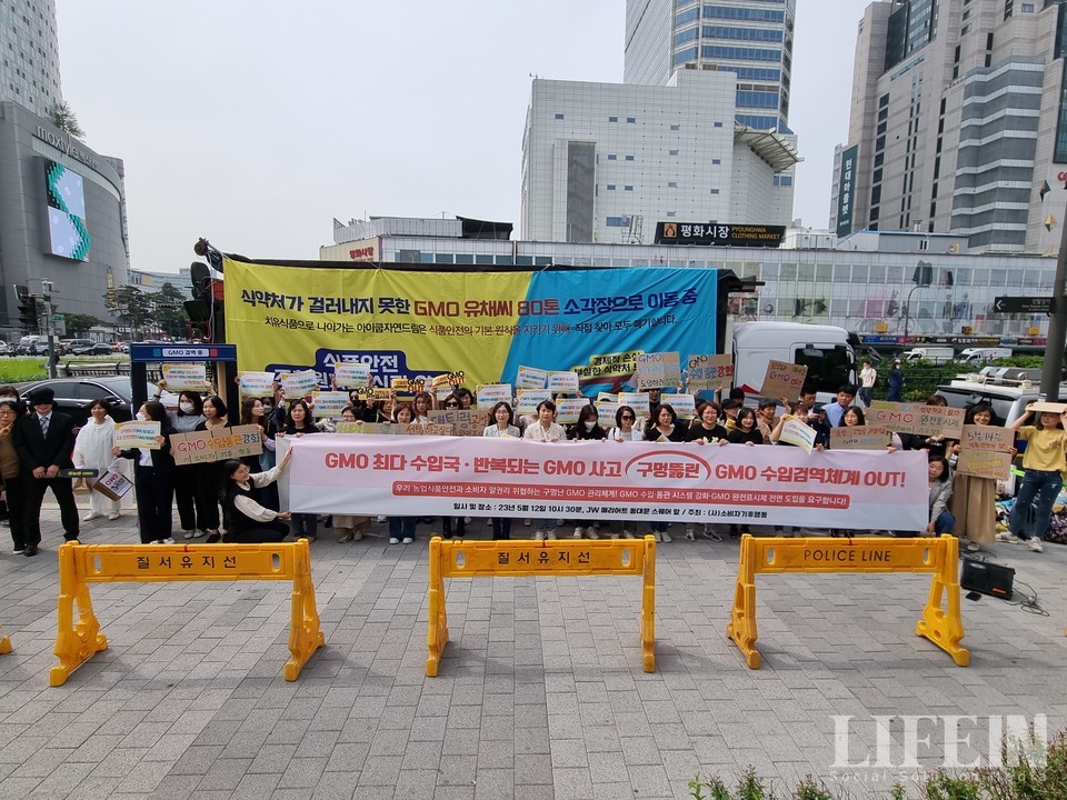 (사)소비자기후행동이 12일 오전 10시 JW메리어트 동대문 스퀘어 서울(종로구 소재) 앞에서 GMO 수입·통관제도에 항의하고 GMO완전표시제를 촉구하는 퍼포먼스를 펼쳤다.
