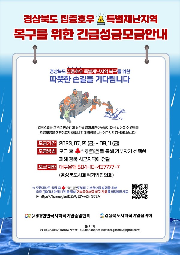 모금 기간은 8월 11일까지이며, 모금 계좌는 대구은행 (504-10-437777-7, 경상북도사회적기업협의회)이다. 모금 후 모인 성금은 경북사회복지공동모금회를 통해 피해지역에 전달할 예정이다.