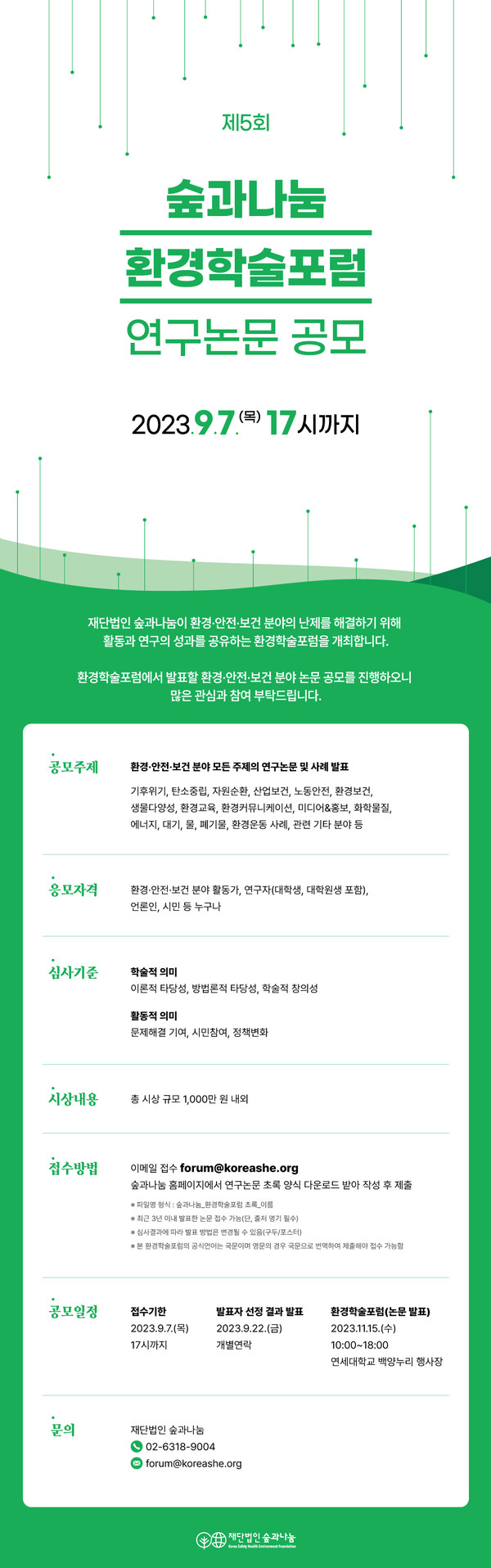 숲과나눔 환경학술포럼은 환경·안건·보건 분야의 난제를 해결하기 위해 활동과 연구의 성과를 공유하는 교류의 장으로 올해로 5회를 맞이한다. 연구논문 및 사례 발표와 관련한 논문 공모를 통해 발표자를 선정하며 세부주제는 ▲기후위기 ▲탄소중립 ▲자원순환 ▲산업보건 ▲노동안전 ▲환경보건 ▲생물다양성 ▲환경교육 ▲환경커뮤니케이션 ▲미디어&홍보 ▲화학물질 ▲에너지 ▲대기 ▲물 ▲폐기물 ▲환경운동 사례 등이다.