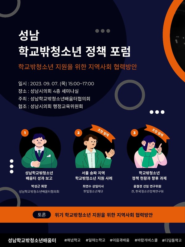 오는 9월 7일 오후 3시, 성남시의회 세미나실에서 '학교밖청소년 성장과 자립을 위한 지역사회 협업방안'을 주제로 정책 포럼이 개최된다. 성남 학교밖청소년 배움터 협의회가 주최하는 이번 포럼은 ▲최연수 한빛청소년재단 상임이사가 '서울 송파구 한빛청소년 대안센터' 사례발표를 ▲윤철경 전 한국청소년정책연구원 상임연구위원이 '학교밖청소년 정책 현황과 향후 방향' 발제를 맡을 예정이다. 참가 신청은 온라인 링크를 통해 가능하다.
