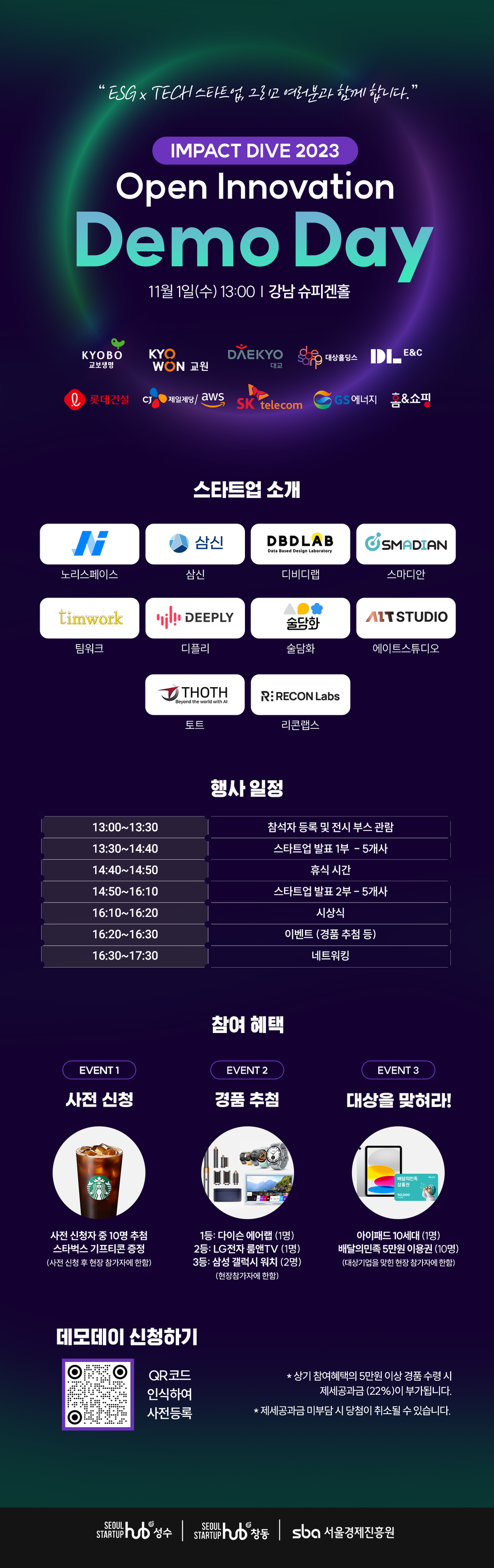 참여 스타트업은 ▲노리스페이스 ▲삼신 ▲디비디랩 ▲스마디안 ▲디플리 ▲리콘랩스 ▲술담화 ▲팀워크 ▲토트 ▲에이트스튜디오이며, 대·중견기업은 ▲교보생명 ▲교원 ▲대교 ▲대상홀딩스 ▲롯데건설 ▲홈앤쇼핑 ▲CJ제일제당/AWS ▲DL이앤씨 ▲GS에너지 ▲SKT가 참여했다.