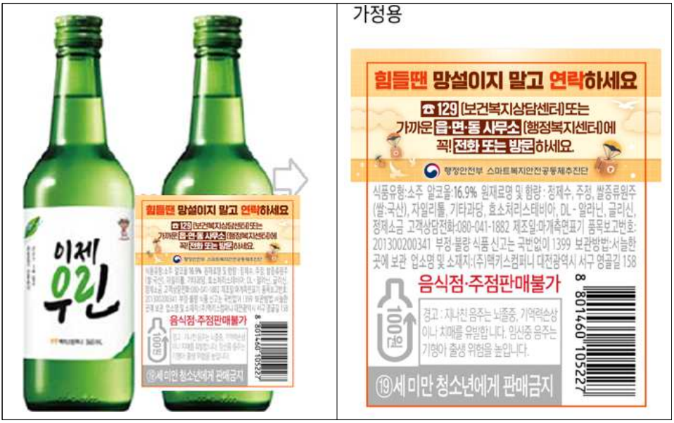 소주병 뒷면에 붙은 라벨에는 '힘들 땐 ☎129(보건복지상담센터) 또는가까운 읍·면·동 사무소(행정안전복지센터)에 꼭! 전화 또는 방문하세요' 라는 문구가 기재된다.