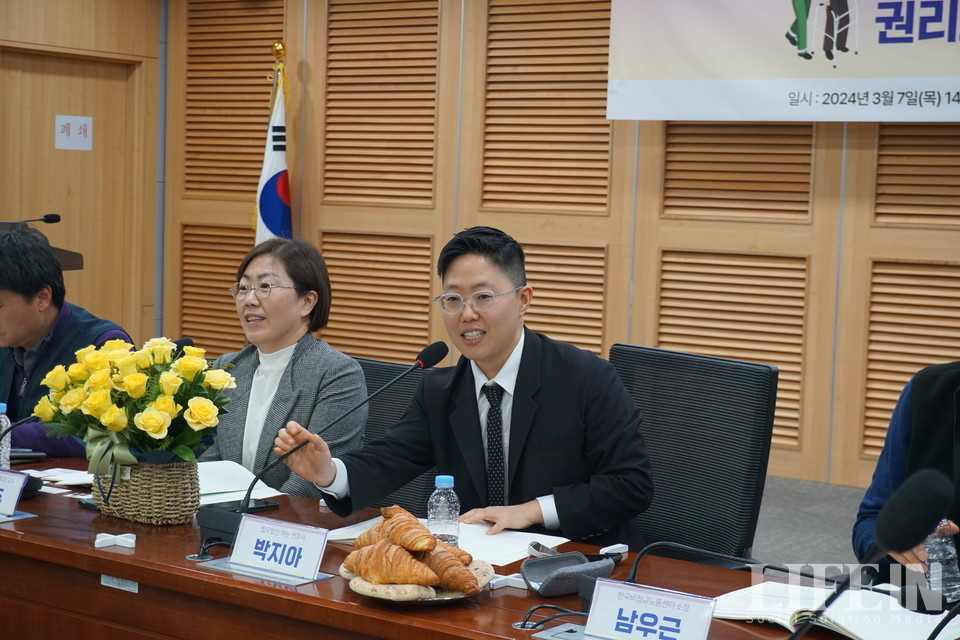 장애인활동지원사 현실에 대해 이순화 전국정보경제서비스연맹 다같이유니온 장애인활동지원사지부 사무국장은 ▲이용자 편의 및 선택에 따라 장애인활동지원사의 교체 및 해고가 쉬워 상시적 고용불안이 존재 ▲대체인력이 없기에 연차가 있어도 쓸 수 없음 ▲재가 특성 상 별도의 휴게장소 및 시간이 없어 공짜 노동이 발생하는 등의 문제를 짚고, △국가와 지자체가 장애인활동지원기본계획 수립 및 실태조사 실시 △장애인활동지원 급여비용의 합리적 산출을 위해 당사자가 참여 △임금지급방식을 월급제로 전환 등을 요구했다.