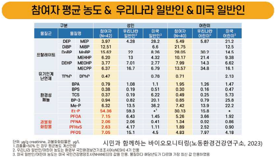 과불화화합물은 인체에 유입되면 장기간 머무는데, 한국인에게서는 미국인에 비해 약 5배 정도 넘게 검출됐다. 김원 실장은 "여러분들이 죽고 난 다음에 여러분들(의 신체)은 없어지겠지만 과불화화합물은 남을 것"이라며 플라스틱에 사용 노출에 대한 경각심을 높였다.