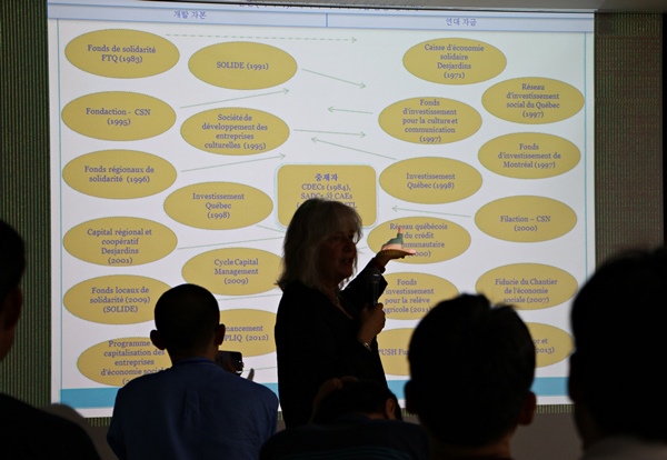 사회적경제와 사회적금융 분야 전문가 2명이 참석해 캐나다 퀘벡주에서 진행된 사회적연대금융 활동사례를 소개했다. 마거릿 멘델 교수는 캐나다 콘코디아대학 교수로 경제학자이자, 칼폴라니 사회경제연구소장이다. 밀더 비예가스는 국제사회적경제투자연합(INAISE) 회장이자, 퀘벡주에 있는 사회적금융 기관인 필락시온 사무국장이다. 그들이 소개한 캐나다 퀘벡주 지역은 사회적금융의 천국이었다. 사회연대경제(사회적경제) 주체들이 사회책임금융(사회적금융)을 통해 자금을 조달할 수 있는 기회가 곳곳에서 주어졌다. 한국사회 현실과 너무 달랐다.