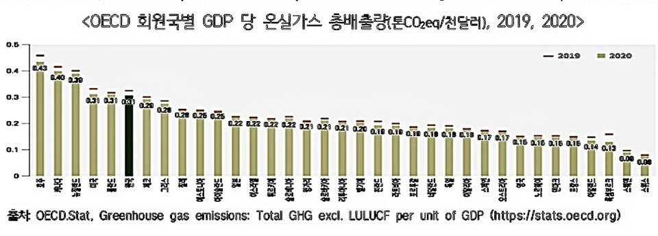 이에 비해 한국의 현실을 살펴보면 심각하다. 온실가스 총배출량은 2021년 기준 6억 7,660만 톤인데 이를 국내총생산 GDP를 가지고 1천 달러당 온실가스 배출량을 보면 6.31톤CO2eq로 호주, 캐나다, 뉴질랜드, 미국에 이어 폴란드와 함께 다섯 번째로 많았다. 반면에 전체 최종 소비 에너지 중에 재생에너지의 비중을 보면 3.6%(2019년 기준)로 OECD 회원 37개 국가 중에 가장 낮다. 이는 OECD 평균인 14.9%의 4분의 1 수준이다(전자신문, 2024. 3. 21.). 2022년도 여전히 5.2% 수준이다. 이는 "지구 기후 위기에 나쁜 영향을 미치면서 위기를 극복하는 데에는 매우 인색하다"는 뜻이다.