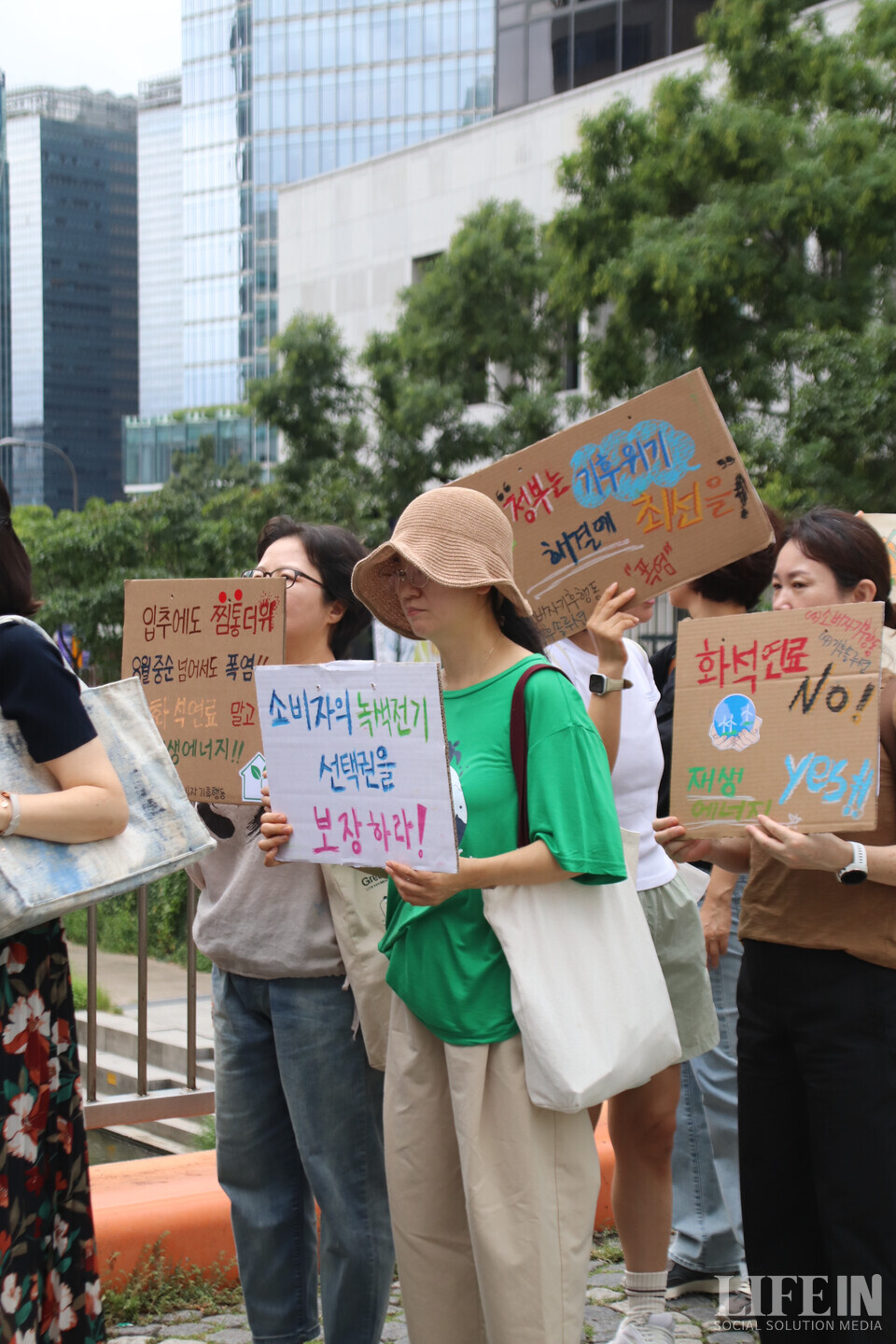 헌법재판소 앞에는 '소비자에게 재생에너지 구매를 허용하지 않는 산업부 고시 조항이 위헌임을 확인하라'는 발언이 울려퍼졌다.