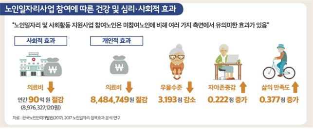 한국에만 있는 독특한 노인일자리 사업. 이미 오랜 시간 많은 연구를 통해 다양한 효과를 검증하였다. 우선 공익활동 일자리에 참여하는 기초연금 수급자의 경우 보충적 소득 기능을 통해 빈곤을 낮출 수 있다. 외로움, 고독 등 심리적 안정이 필요한 대상들에게는 사회공동체 일원으로 어울릴 수 있는 장을 만들어 고독사, 치매와 같은 사회문제에 적극적으로 대응할 수 있는 체계를 갖추게 한다. 내가 사는 동네에서 일을 통해 경제적 지원을 받고 건강도 챙기면서 타인을 도울 수 있다는 맥락은 정부가 추진하는 지역사회 통합돌봄과도 그 궤를 같이한다고도 볼 수 있겠다.