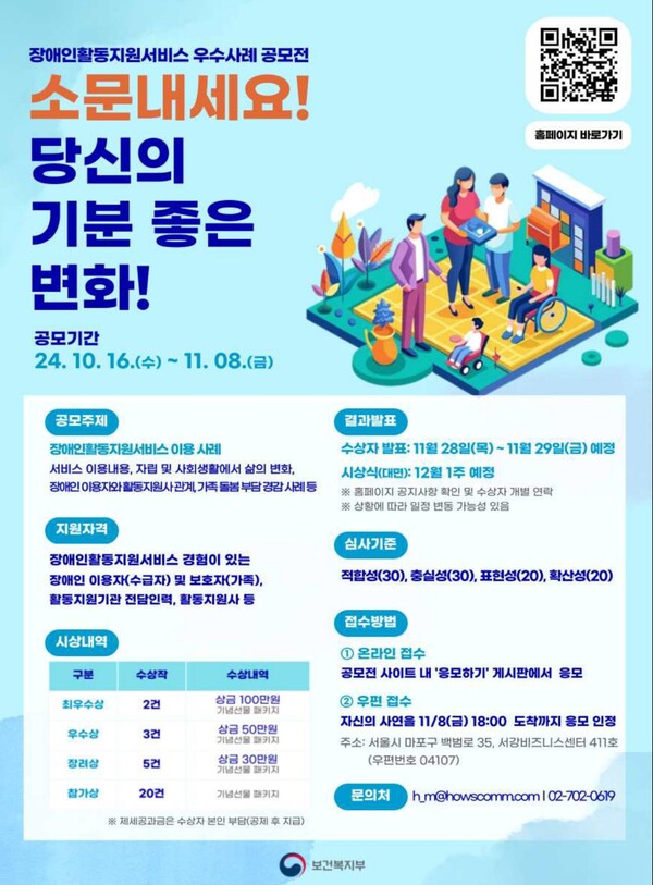 이번 우수사례 공모전은 장애인 활동지원 이용자 및 그 보호자, 활동지원기관 전담인력 등 장애인을 돌봄과 관련된 사람이라면 누구나 참여할 수 있다. 공모전 제목은 '소문내세요! 당신의 기분 좋은 변화!'다. 활동지원서비스를 통해 긍정적인 삶의 에너지를 주변에 전파하자는 취지다.