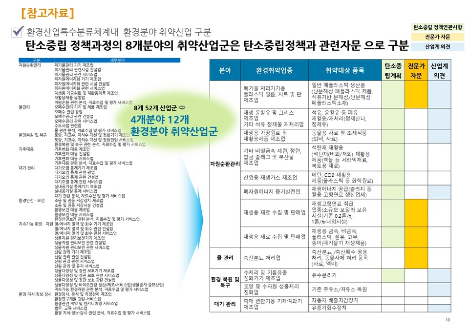 송 박사가 환경산업특수분류체계 내 환경분야 취약산업을 구분한 결과 ▲자원순환관리 ▲물 관리 ▲환경 복원 및 복구 ▲대기 관리 분야에 12개의 환경취약업종과 세부 취약대상 품목을 도출할 수 있었다. 단, 탄소중립 계획만으로 산업군을 분류하는 것은 제한적이기에 산업계 및 전문가 자문도 수렴했다고 밝혔다. 송 박사는 결과를 두고 "폐기물 처리기와 관련된 산업군은 이견이 없을 정도의 취약 업종이다. 하지만 전문가는 재생 재료를 수집·판매하는 업종이 오히려 취약대상 품목이 될 수 있을 거라 의견을 비췄다"며 그 차이를 짚었다.