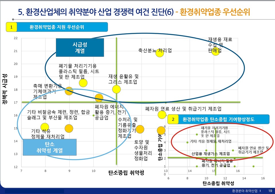 특히 그는 환경취약기업을 두고 펠릿 및 바이오매스 보일러 제조업, 지정 외 폐기물 처리업 등에 대해 품목 및 업종 변경에 대한 지원이 필요하다고 제언했다. 또, 폐기물 처리기기용 플라스틱 필름, 시트 및 판 제조업의 경우 매출 특성과 관련해 업종 평균 대비 95%, 노동 생산성 업종 평균 대비 92% 수준의 경쟁력을 가지고 있다며 "취약영역 지원을 고려해 기존의 일반 폐플라스틱 생산품을 축소해 제품 생산의 다각화를 고민해 보는 것도 방법"이라 부연했다.