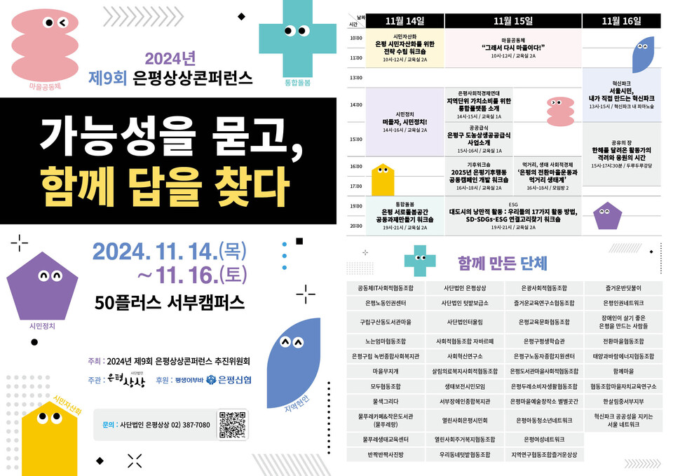 오는 14일부터 16일까지, 서울시 은평구 서울혁신파크 내에 위치한 50플러스 서부캠퍼스에서 '은평상상 콘퍼런스'가 개최된다. 올해의 주제는 '가능성을 묻고, 함께 답을 찾다'로, 지역사회와 마을공동체의 잠재적 가능성을 발굴하고 이를 위한 통합적 해법을 논의하는 자리다.