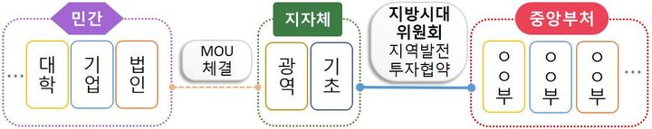민관상생 투자협약은 지역 활성화 사업에 민간의 창의성·전문성을 활용하기 위해 민간이 주도적으로 지역 상생사업을 기획·운영하고, 공공은 시설 조성 등을 통해 지원하는 협력형 사업이다. 사업에 선정된 지자체는 정부와 지역발전투자협약을 체결해 국비 지원 등 행정·재정적 지원을 받게 되며, 민간은 지자체와 MOU를 체결해 지역 활성화 사업에 참여하게 된다.