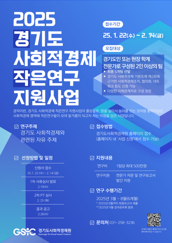 경기도사회적경제원이 사회적경제 연구 활동을 지원하는 '2025 경기도 사회적경제 작은연구 지원사업' 참여자를 내달 14일까지 모집한다.