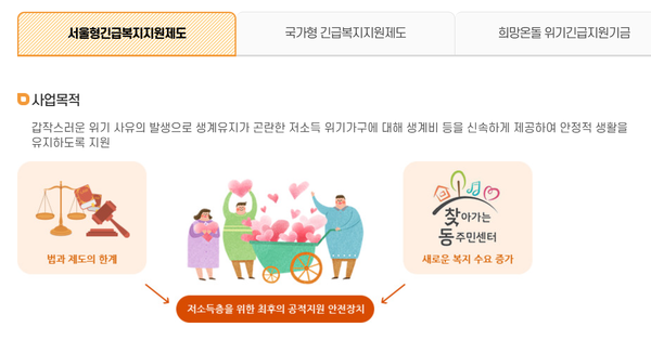 올해 시작된 '서울형 긴급복지제도'는 주소득자의 사망, 질병, 실직, 휴·폐업 등으로 위기에 놓인 시민이 「기초생활보장법」, 「서울형 기초보장」 등 다른 법령·조례 등 지원을 하기 전 일시적으로 신속하게 지원하는 제도다.
