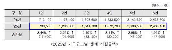 지원금액도 올랐다. 서울형 긴급복지지원 '생계급여'는 1인 가구 기준 2.4%('24년 713,100원→ '25년 730,500)·4인 가구 2.1% ('24년 1,833,500원→ '25년 1,872,700원) 인상됐다. 시는 이번 인상으로 최근 고물가, 경기 침체로 어려움을 겪고 있는 저소득 가구에 실질적인 도움을 줄 것으로 기대하고 있다.