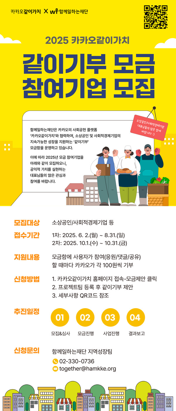 참여를 원하는 기업은 카카오같이가치 홈페이지에 접속해 '모금제안'을 클릭한 후, 프로젝트팀을 등록하고 '같이기부'를 제안하면 된다. 세부사항은 함께일하는재단 홈페이지 또는 QR코드를 통해 확인할 수 있다.