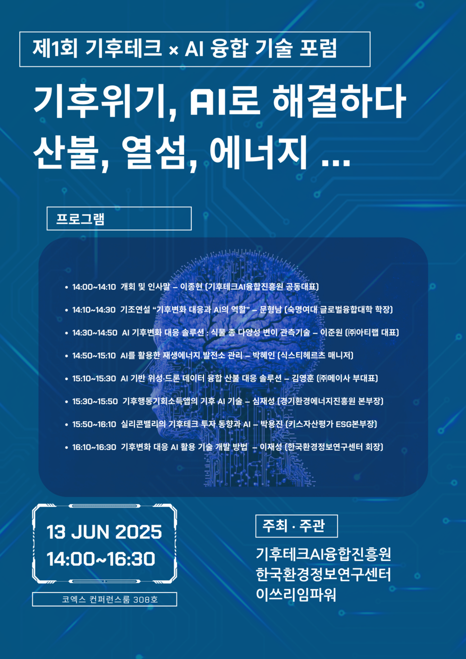 '기후테크 × AI 융합 기술 포럼'이 13일 오후 2시부터 서울 코엑스 컨퍼런스룸 308호에서 개최된다. 이번 행사는 기후테크AI융합진흥원이 주최하고, 한국환경정보연구센터(KERIC)와 이쓰리임파워가 공동 주관하며, (사) 지속가능과학회와 AVPN 한국대표부가 후원한다. 기후 관련 산업계, 스타트업, 연구기관, 공공기관 등이 참여해 AI와 기후기술의 융합 가능성을 종합적으로 논의할 예정이다.