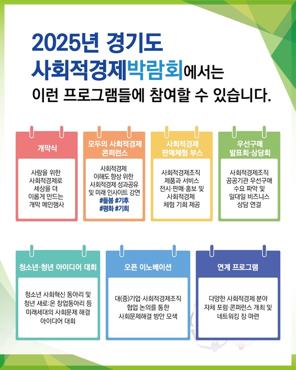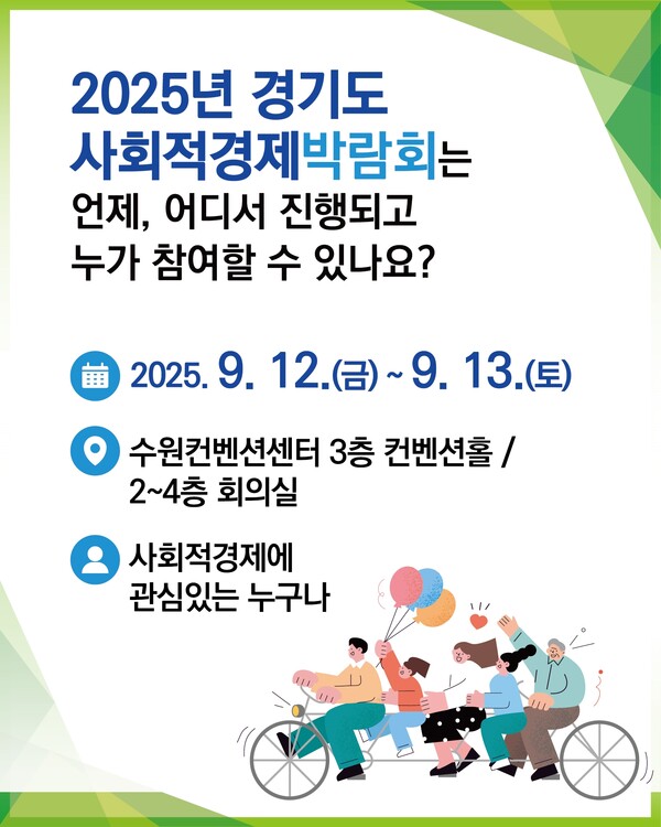경기도와 경기도사회적경제원은 오는 9월 12일부터 13일까지 이틀간 수원컨벤션센터에서 '2025년 경기도사회적경제박람회'를 개최한다. 이번 박람회는 사회적경제에 관심 있는 누구나 참여할 수 있으며, 다양한 포럼과 콘퍼런스, 청소년·청년 아이디어 대회, 체험형 부스 등이 마련되어 도민과 함께 사회적경제의 가치를 공유하는 장이 될 예정이다.