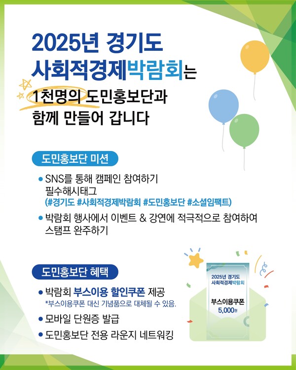 도민홍보단에게는 ▲SNS 캠페인 참여(필수 해시태그: #경기도 #사회적경제박람회 #도민홍보단 #소셜임팩트) ▲행사 내 이벤트·강연 참여 ▲스탬프 완주 미션 등이 주어지며, 참여자에게는 부스 이용 할인쿠폰(기념품 대체 가능), 모바일 단원증 발급, 도민홍보단 전용 라운지 네트워킹 혜택이 제공된다.