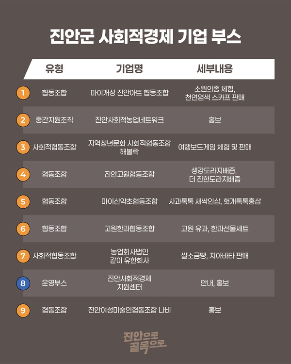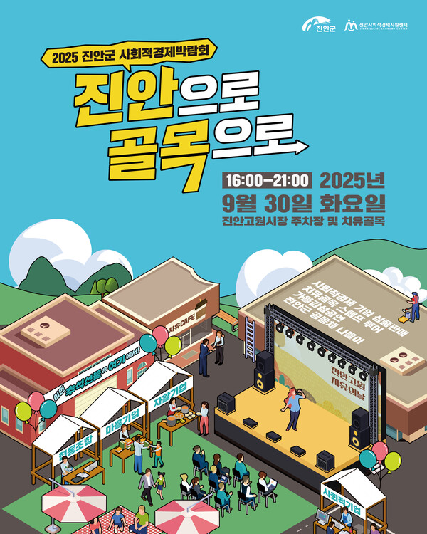 진안군은 오는 9월 30일 오후 4시부터 9시까지 진안고원시장 주차장과 치유골목 일대에서 '2025 진안군 사회적경제박람회'를 개최한다. 이번 박람회는 '진안으로 골목으로'라는 슬로건 아래 지역 사회연대경제 기업들이 한자리에 모여 다양한 체험과 판매, 홍보 활동을 선보인다.