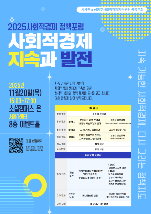 '2025 사회적경제 정책 포럼 - 사회적경제 지속과 발전'은 오후 3시부터 5시 30분까지 소셜캠퍼스 온 서울1센터에서 진행되며, 사회연대경제조직 임직원과 중간지원조직 실무자 등 50여 명이 참석할 예정이다.