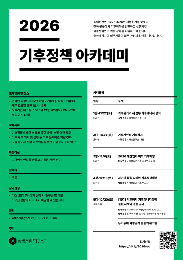 녹색전환연구소가 지역에서 기후의제를 실천하고 정책화하려는 실무자를 위한 교육 프로그램 '2026 기후정책 아카데미'를 열고, 오는 21일까지 참가 신청을 받는다.