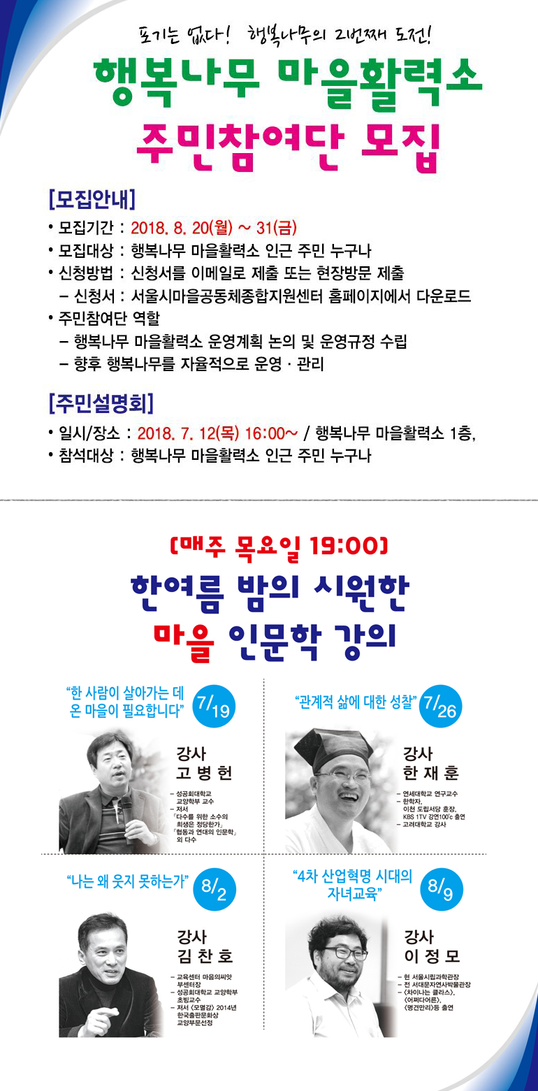 또한, 행복나무 활성화 및 주민들의 관심과 참여를 높이기 위해 7월 19일부터 8월 9일까지 4주간 매주 목요일 오후 7시에 '한여름 밤의 시원한 마을 인문학 강의'를 진행한다. ①고병헌 성공회대 교수가 '한 사람이 살아가는 데 온 마을이 필요합니다'(7.19.) ②한재훈 연세대학교 연구 교수이자 한학자가 '관계적 삶에 대한 성찰'(7.26.) ③김찬호 마을의 씨앗 부센터장의 '나는 왜 웃지 못하는가'(8.2.) ④이정모 서울시립과학관장의 ‘4차 산업혁명 시대의 자녀 교육’(8.9.) 강의가 진행될 예정이다.