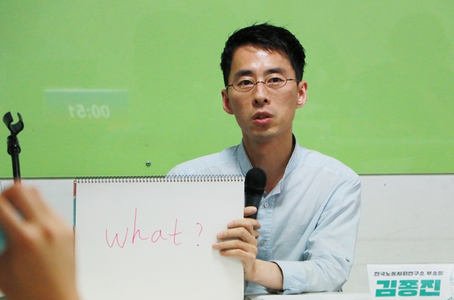 김종진 부소장은 "도대체 뭐 한 거지?"라는 말로 발언을 시작했다. 최저임금 1만원은 이미 대통령 공약사항이었고 그만큼 충분한 검토와 대응책, 연차별 상승 지표가 있었다. 그런데 도대체 정부나 노동계가 무엇을 했냐는 것이다. "최저임금 1만원 실현과 소상공인 대책 마련은 이미 국정과제에 동시에 제시돼 있다. 그나마 노동부는 최저임금 1만원에 대해 이런저런 이야기를 했지만 산자부나 중소벤처기업부는 지난 일 년 반 동안 한 게 하나도 없다"고 말하며 "지난해 하반기부터 경영계가 이미 치고 들어오기 시작했다. 이에 대해 노동계 스스로가 제대로 이야기도 못 했고 대응도 못 했다. 제대로 된 전략과 전술이 있었는지 물음표"라고 꼬집었다.