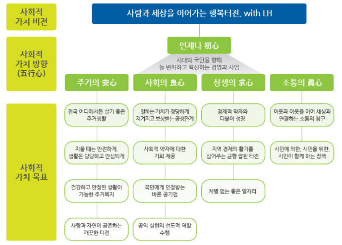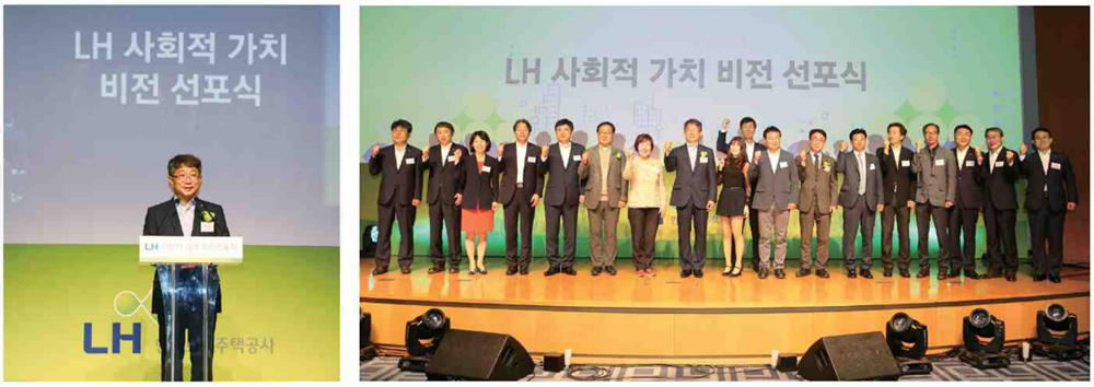 LH는 먼저 지속가능한 사회적 가치 실현을 고민했다. 이때 임직원의 자발성이 무엇보다 중요하다고 판단해 올해 연초부터 직원 인식전환, 역량강화 교육, 제도정비등 사회적 가치 내재화를 위해 힘써왔다. 노력의 성과물로 지난 6월에는 'LH 사회적 가치 비전 선포식'을 진행해, "국민의 신뢰를 얻는 것을 경영의 근본으로 삼아, 변화와 혁신을 통해 사회적 가치를 실현하고 국민의 삶터와 일터를 행복이 가득한 공간으로 만들 것"을 공표한바 있다.