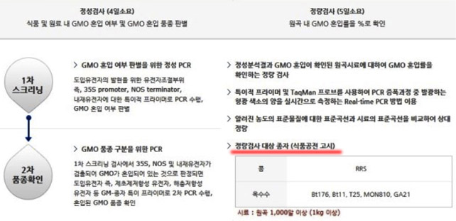 지난해 유전자변형 식품등의 표시기준이 일부개정되기 전에는 '유전자변형식품 등의 표시기준' 8조 표시사항의 적용특례에 따라 유전자변형농산물이 3% 이하로 포함된 경우 구분유통증명서나 정부증명서, 검사성적서로 갈음할 수 있었다.