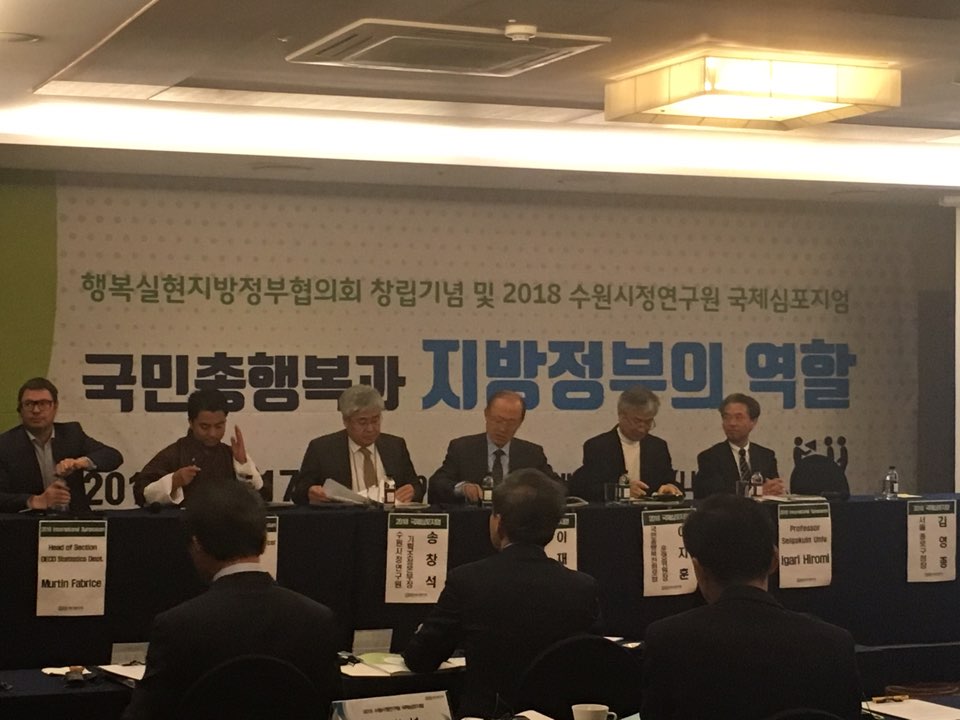 '사람 중심'의 패러다임 전환이 필요한 시기에 맞춰, 지난 17일 수원 이비스호텔에서 지방정부 관계자와 시민 약 300명이 참석한 가운데, 수원시정연구원의 국제 심포지움이 개최되었다. ‘국민총행복과 지방정부의 역할’을 주제로 첸초 부탄 국민총행복위원회 기획국장, 페브리스 머틴 OECD 통계부 선임연구원, 히로미 이가리 세인가쿠인 대학 특임교수, 김영종 서울 종로구청장이 초청되어 ‘시민의 행복한 삶’에 대해 심도 있는 발제와 토론이 진행됐다.