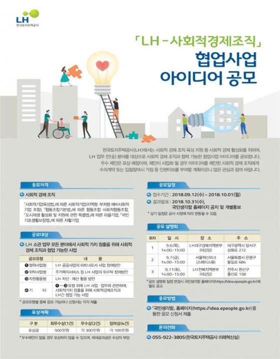 한국토지주택공사(LH)가 사회적경제조직을 대상으로 공모한 'LH-사회적경제조직 협업사업 아이디어 공모' 선정 결과를 1일 발표했다.