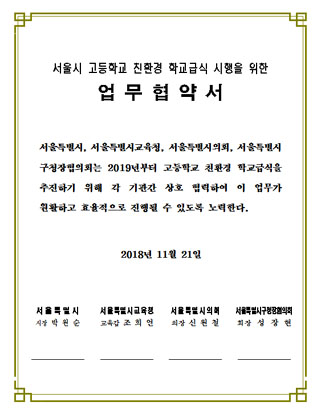 박원순 시장과 25개 자치구청장, 조희연 서울시교육감, 신원철 서울시의회 의장은 21일 오전 9시 30분 이와 같은 합의 내용을 담은 '고등학교 친환경 학교급식 전면시행 계획'을 발표하고 서울시-자치구-교육청-시의회 합동협약을 체결했다.